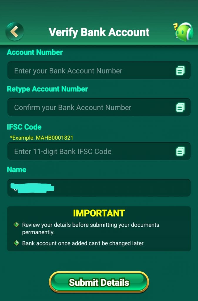 - Bank Account Number enter kare